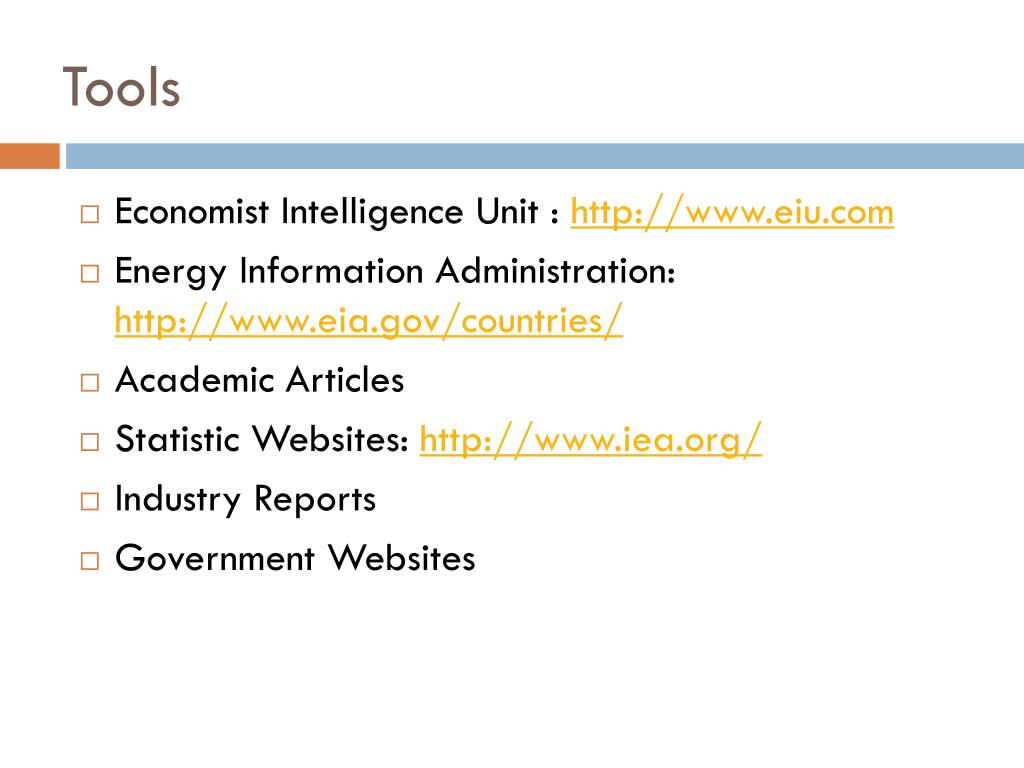 Tools • Economist Intelligence Unit : http://www.eiu.com • Energy Information Administration: http://www.eia.gov/countries/ • Academic Articles • Statistic Websites: http://www.iea.org/ • Industry Reports • Government Websites
