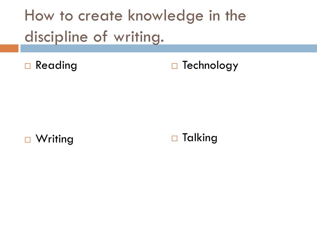 How to create knowledge in the discipline of writing. • Reading • Writing • Technology • Talking