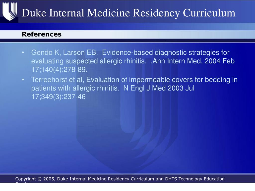 References • Gendo K, Larson EB. Evidence-based diagnostic strategies for evaluating suspected allergic rhinitis. .Ann Intern Med. 2004 Feb 17;140(4):278-89. • Terreehorst et al, Evaluation of impermeable covers for bedding in patients with allergic rhinitis. N Engl J Med 2003 Jul 17;349(3):237-46