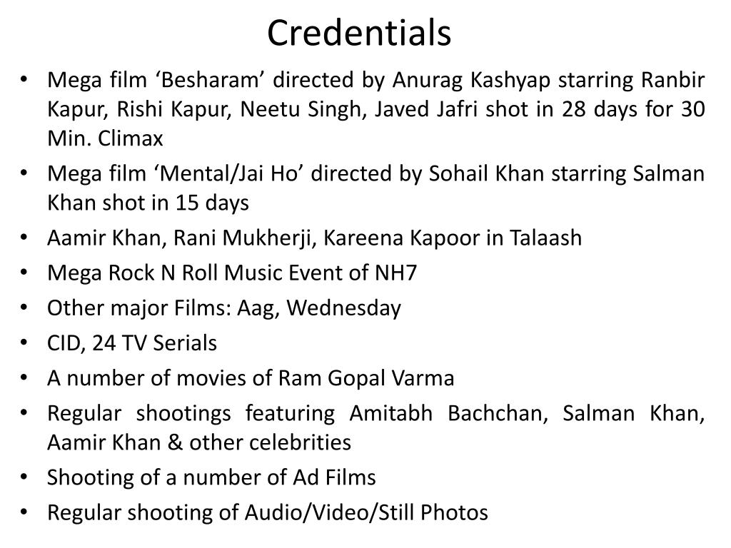 Credentials • Mega film ‘Besharam’ directed by Anurag Kashyap starring Ranbir Kapur, Rishi Kapur, Neetu Singh, Javed Jafri shot in 28 days for 30 Min. Climax • Mega film ‘Mental/Jai Ho’ directed by Sohail Khan starring Salman Khan shot in 15 days • Aamir Khan, Rani Mukherji, Kareena Kapoor in Talaash • Mega Rock N Roll Music Event of NH7 • Other major Films: Aag, Wednesday • CID, 24 TV Serials • A number of movies of Ram Gopal Varma • Regular shootings featuring Amitabh Bachchan, Salman Khan, Aamir Khan & other celebrities • Shooting of a number of Ad Films • Regular shooting of Audio/Video/Still Photos