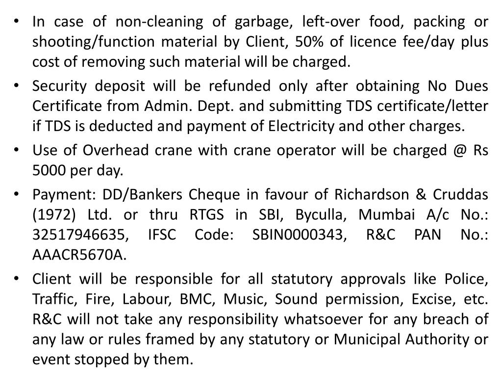 In case of non-cleaning of garbage, left-over food, packing or shooting/function material by Client, 50% of licence fee/day plus cost of removing such material will be charged. • Security deposit will be refunded only after obtaining No Dues Certificate from Admin. Dept. and submitting TDS certificate/letter if TDS is deducted and payment of Electricity and other charges. • Use of Overhead crane with crane operator will be charged @ Rs 5000 per day. • Payment: DD/Bankers Cheque in favour of Richardson & Cruddas (1972) Ltd. or thru RTGS in SBI, Byculla, Mumbai A/c No.: 32517946635, IFSC Code: SBIN0000343, R&C PAN No.: AAACR5670A. • Client will be responsible for all statutory approvals like Police, Traffic, Fire, Labour, BMC, Music, Sound permission, Excise, etc. R&C will not take any responsibility whatsoever for any breach of any law or rules framed by any statutory or Municipal Authority or event stopped by them.
