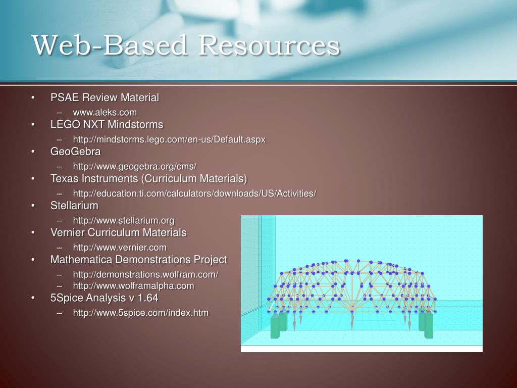Web-Based Resources • PSAE Review Material • www.aleks.com • LEGO NXT Mindstorms • http://mindstorms.lego.com/en-us/Default.aspx • GeoGebra • http://www.geogebra.org/cms/ • Texas Instruments (Curriculum Materials) • http://education.ti.com/calculators/downloads/US/Activities/ • Stellarium • http://www.stellarium.org • Vernier Curriculum Materials • http://www.vernier.com • Mathematica Demonstrations Project • http://demonstrations.wolfram.com/ • http://www.wolframalpha.com • 5Spice Analysis v 1.64 • http://www.5spice.com/index.htm