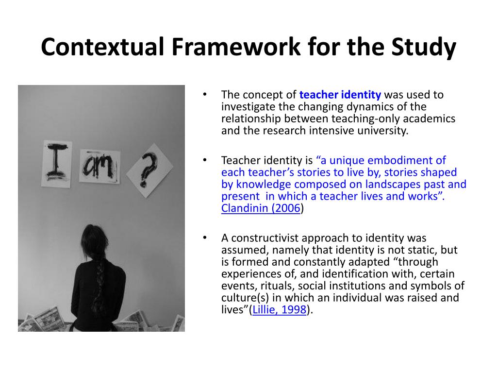 Contextual Framework for the Study • The concept of teacher identity was used to investigate the changing dynamics of the relationship between teaching-only academics and the research intensive university. • Teacher identity is “a unique embodiment of each teacher’s stories to live by, stories shaped by knowledge composed on landscapes past and present in which a teacher lives and works”. Clandinin (2006) • A constructivist approach to identity was assumed, namely that identity is not static, but is formed and constantly adapted “through experiences of, and identification with, certain events, rituals, social institutions and symbols of culture(s) in which an individual was raised and lives”(Lillie, 1998).