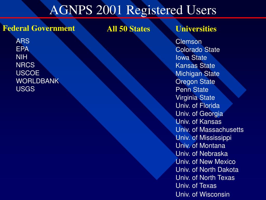 AGNPS 2001 Registered Users • Federal Government • ARSEPANIHNRCS • USCOEWORLDBANK • USGS • All 50 States • Universities • ClemsonColorado StateIowa StateKansas StateMichigan StateOregon StatePenn StateVirginia State Univ. of FloridaUniv. of GeorgiaUniv. of KansasUniv. of MassachusettsUniv. of MississippiUniv. of MontanaUniv. of NebraskaUniv. of New MexicoUniv. of North DakotaUniv. of North TexasUniv. of TexasUniv. of Wisconsin