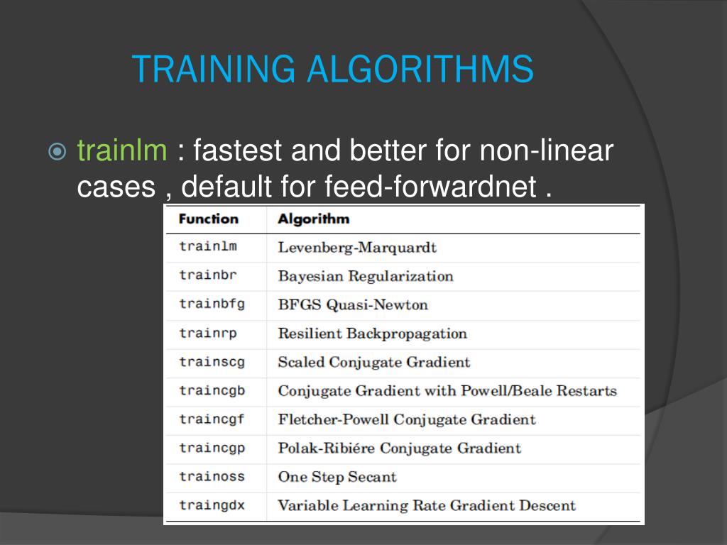 TRAINING ALGORITHMS • trainlm : fastest and better for non-linear cases , default for feed-forwardnet .
