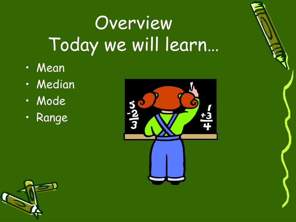 OverviewToday we will learn… • Mean • Median • Mode • Range