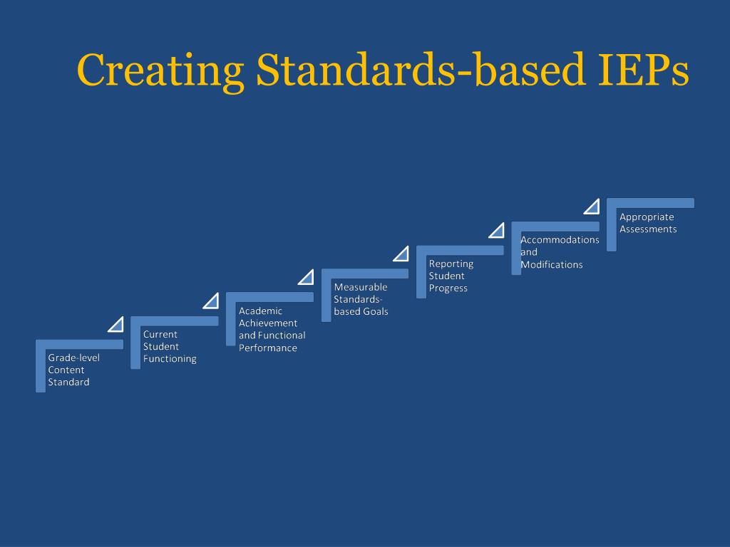 7 Steps to Standards-based IEPs This 7 step process can help school personnel to: a.) consider each student’s strengths and needs to develop goals focused on closing the gap between the student’s levels of academic achievement and grade level standards; and b.) use data to make decisions.