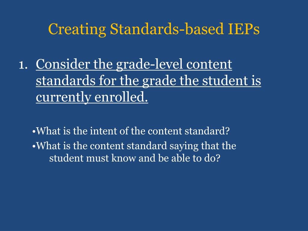 Creating Standards-based IEPs • Consider the grade-level content standards for the grade the student is currently enrolled. • What is the intent of the content standard? • What is the content standard saying that the student must know and be able to do?