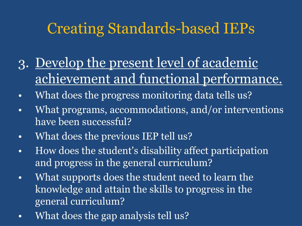 Creating Standards-based IEPs • Develop the present level of academic achievement and functional performance. • What does the progress monitoring data tells us? • What programs, accommodations, and/or interventions have been successful? • What does the previous IEP tell us? • How does the student's disability affect participation and progress in the general curriculum? • What supports does the student need to learn the knowledge and attain the skills to progress in the general curriculum? • What does the gap analysis tell us?