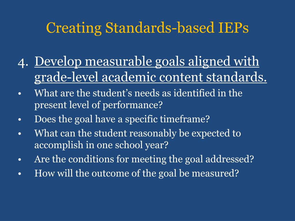 Creating Standards-based IEPs • Develop measurable goals aligned with grade-level academic content standards. • What are the student’s needs as identified in the present level of performance? • Does the goal have a specific timeframe? • What can the student reasonably be expected to accomplish in one school year? • Are the conditions for meeting the goal addressed? • How will the outcome of the goal be measured?