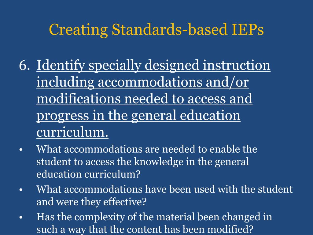 Creating Standards-based IEPs • Identify specially designed instruction including accommodations and/or modifications needed to access and progress in the general education curriculum. • What accommodations are needed to enable the student to access the knowledge in the general education curriculum? • What accommodations have been used with the student and were they effective? • Has the complexity of the material been changed in such a way that the content has been modified?