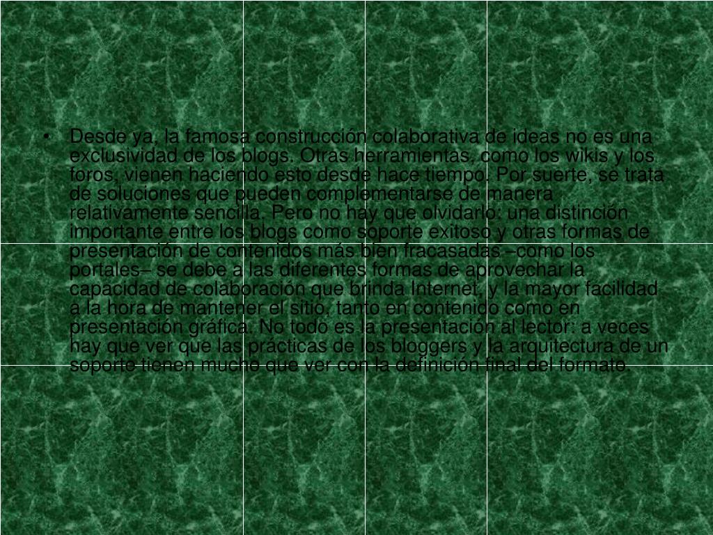 Desde ya, la famosa construcción colaborativa de ideas no es una exclusividad de los blogs. Otras herramientas, como los wikis y los foros, vienen haciendo esto desde hace tiempo. Por suerte, se trata de soluciones que pueden complementarse de manera relativamente sencilla. Pero no hay que olvidarlo: una distinción importante entre los blogs como soporte exitoso y otras formas de presentación de contenidos más bien fracasadas –como los portales– se debe a las diferentes formas de aprovechar la capacidad de colaboración que brinda Internet, y la mayor facilidad a la hora de mantener el sitio, tanto en contenido como en presentación gráfica. No todo es la presentación al lector: a veces hay que ver que las prácticas de los bloggers y la arquitectura de un soporte tienen mucho que ver con la definición final del formato.