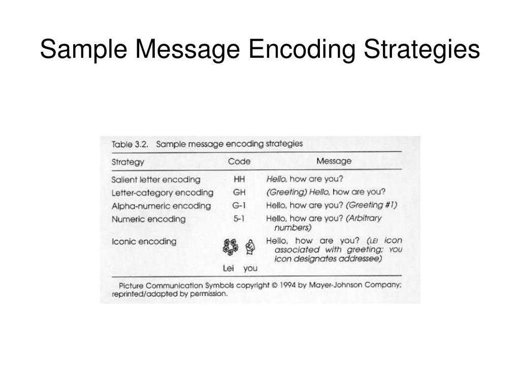 Encoding • Any technique in which the user gives multiple signals that together specify a desired message (Vanderheiden & Lloyd, 1986). • Use of code allows the individual to indicate a small number of items that corresponds to larger vocabulary.