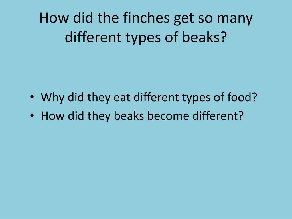 How did the finches get so many different types of beaks? • Why did they eat different types of food? • How did they beaks become different?