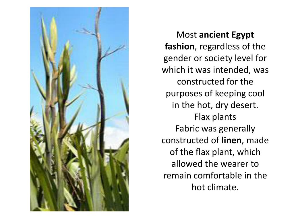 Most ancient Egypt fashion, regardless of the gender or society level for which it was intended, was constructed for the purposes of keeping cool in the hot, dry desert.Flax plantsFabric was generally constructed of linen, made of the flax plant, which allowed the wearer to remain comfortable in the hot climate.