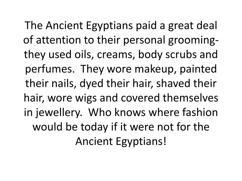 The Ancient Egyptians paid a great deal of attention to their personal grooming-they used oils, creams, body scrubs and perfumes. They wore makeup, painted their nails, dyed their hair, shaved their hair, wore wigs and covered themselves in jewellery. Who knows where fashion would be today if it were not for the Ancient Egyptians!