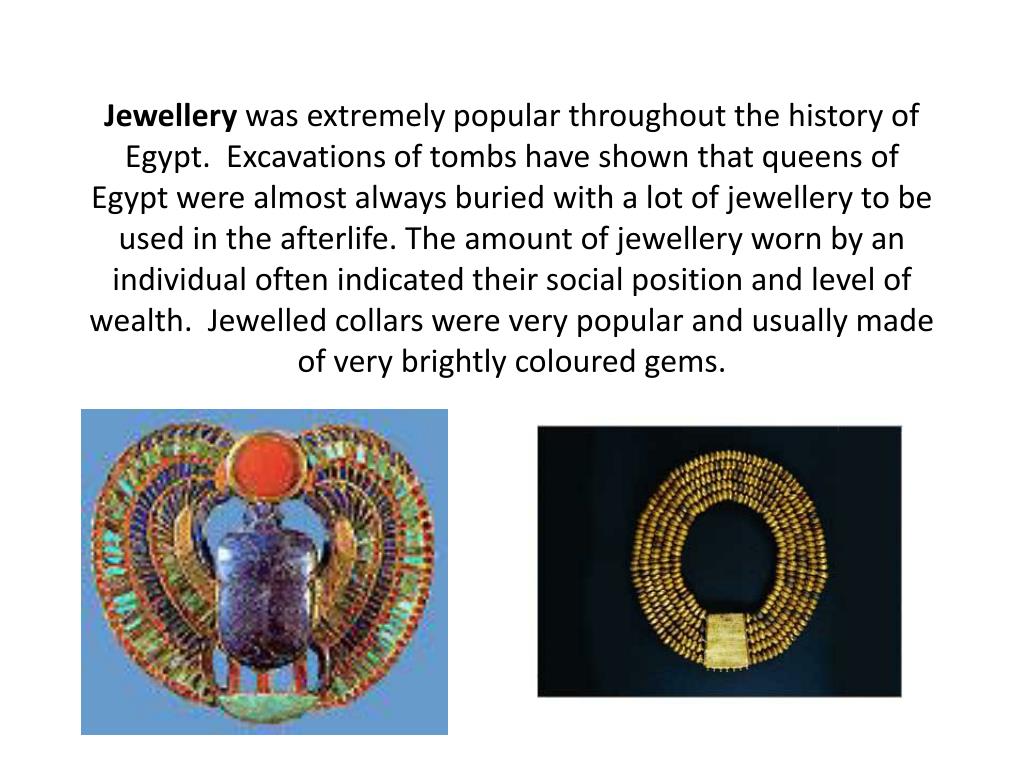 Jewellery was extremely popular throughout the history of Egypt. Excavations of tombs have shown that queens of Egypt were almost always buried with a lot of jewellery to be used in the afterlife. The amount of jewellery worn by an individual often indicated their social position and level of wealth. Jewelled collars were very popular and usually made of very brightly coloured gems.
