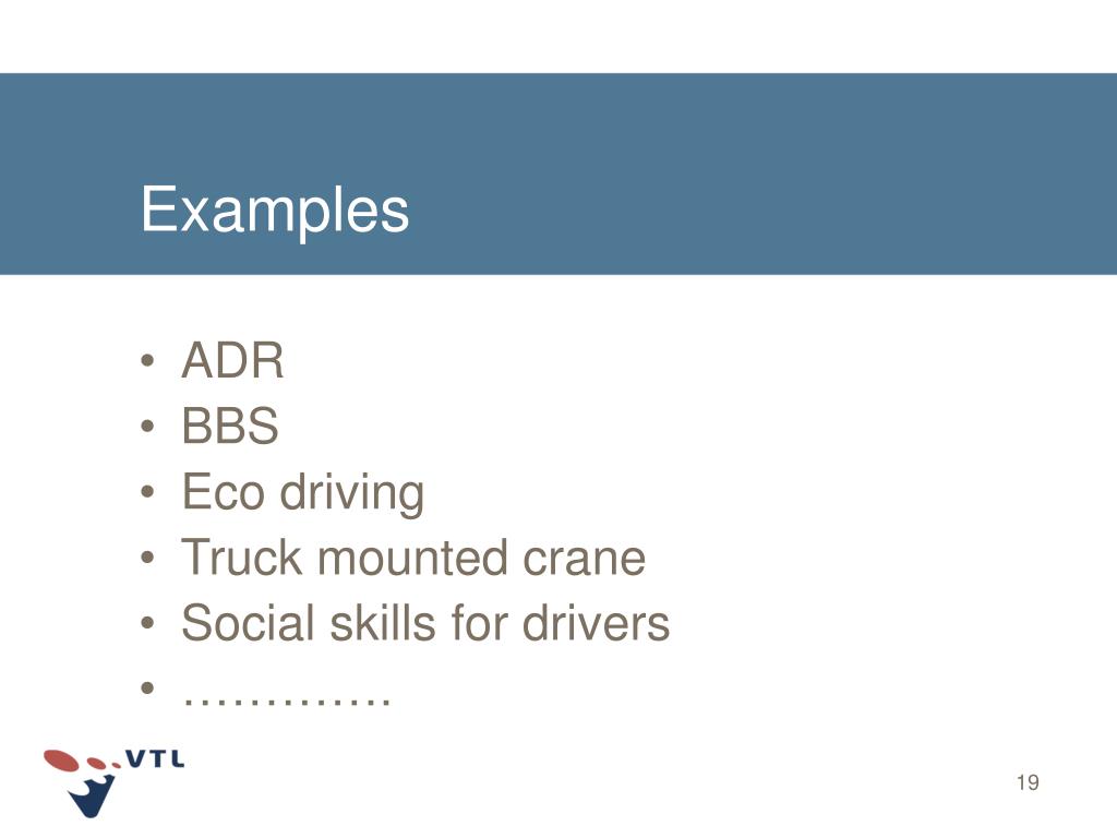 Examples • ADR • BBS • Eco driving • Truck mounted crane • Social skills for drivers • ………….