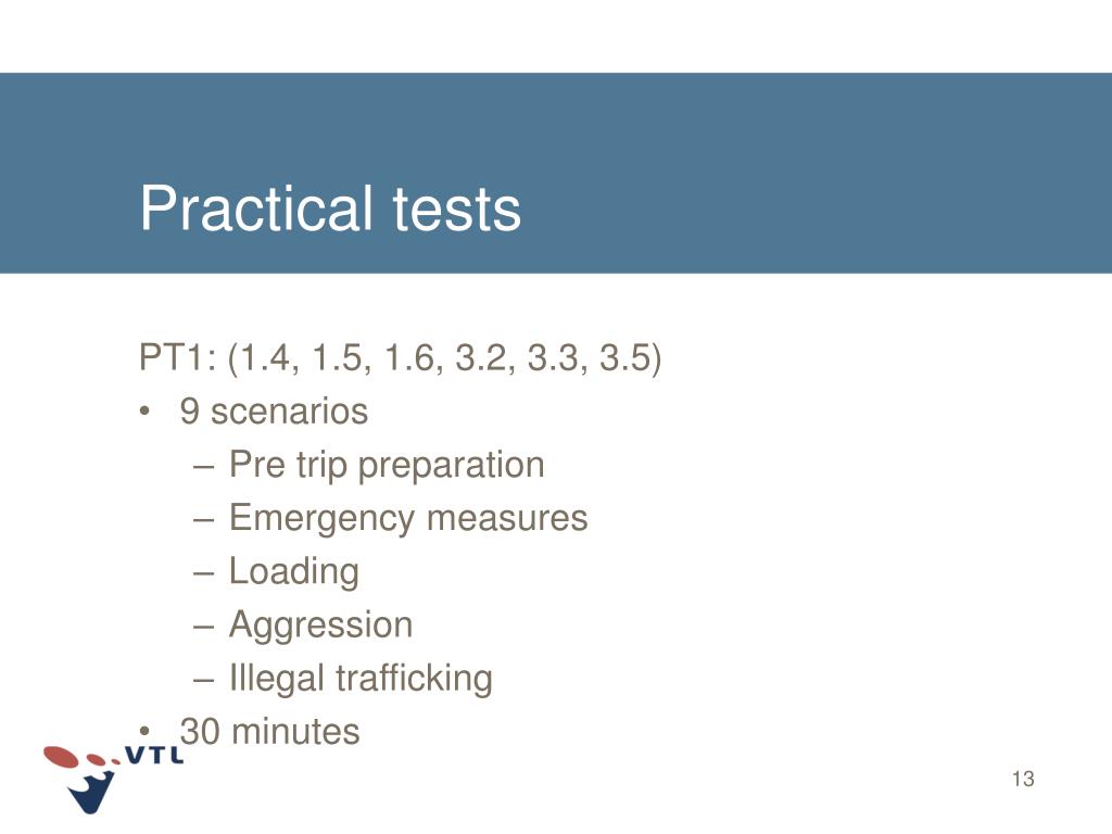 Practical tests PT1: (1.4, 1.5, 1.6, 3.2, 3.3, 3.5) • 9 scenarios • Pre trip preparation • Emergency measures • Loading • Aggression • Illegal trafficking • 30 minutes
