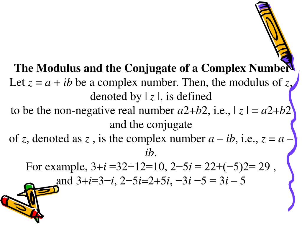 The Modulus and the Conjugate of a Complex Number Let z = a + ib be a complex number. Then, the modulus of z, denoted by | z |, is defined to be the non-negative real number a2+b2, i.e., | z | = a2+b2 and the conjugate of z, denoted as z , is the complex number a – ib, i.e., z = a – ib. For example, 3+i =32+12=10, 2−5i = 22+(−5)2= 29 , and 3+i=3−i, 2−5i=2+5i, −3i −5 = 3i – 5