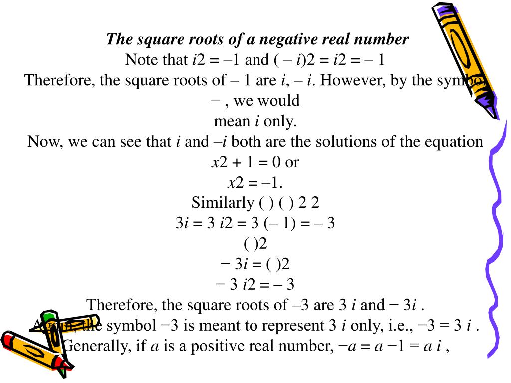 The square roots of a negative real number Note that i2 = –1 and ( – i)2 = i2 = – 1 Therefore, the square roots of – 1 are i, – i. However, by the symbol − , we would mean i only. Now, we can see that i and –i both are the solutions of the equation x2 + 1 = 0 or x2 = –1. Similarly ( ) ( ) 2 2 3i = 3 i2 = 3 (– 1) = – 3 ( )2 − 3i = ( )2 − 3 i2 = – 3 Therefore, the square roots of –3 are 3 i and − 3i . Again, the symbol −3 is meant to represent 3 i only, i.e., −3 = 3 i . Generally, if a is a positive real number, −a = a −1 = a i ,