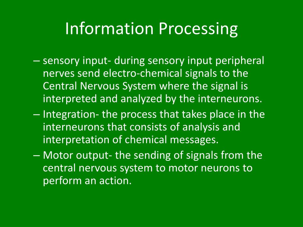 Information Processing • sensory input- during sensory input peripheral nerves send electro-chemical signals to the Central Nervous System where the signal is interpreted and analyzed by the interneurons. • Integration- the process that takes place in the interneurons that consists of analysis and interpretation of chemical messages. • Motor output- the sending of signals from the central nervous system to motor neurons to perform an action.