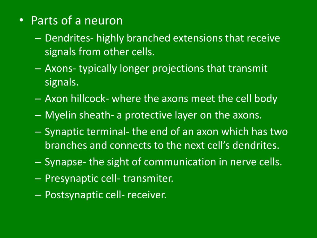 Parts of a neuron • Dendrites- highly branched extensions that receive signals from other cells. • Axons- typically longer projections that transmit signals. • Axon hillcock- where the axons meet the cell body • Myelin sheath- a protective layer on the axons. • Synaptic terminal- the end of an axon which has two branches and connects to the next cell’s dendrites. • Synapse- the sight of communication in nerve cells. • Presynaptic cell- transmiter. • Postsynaptic cell- receiver.
