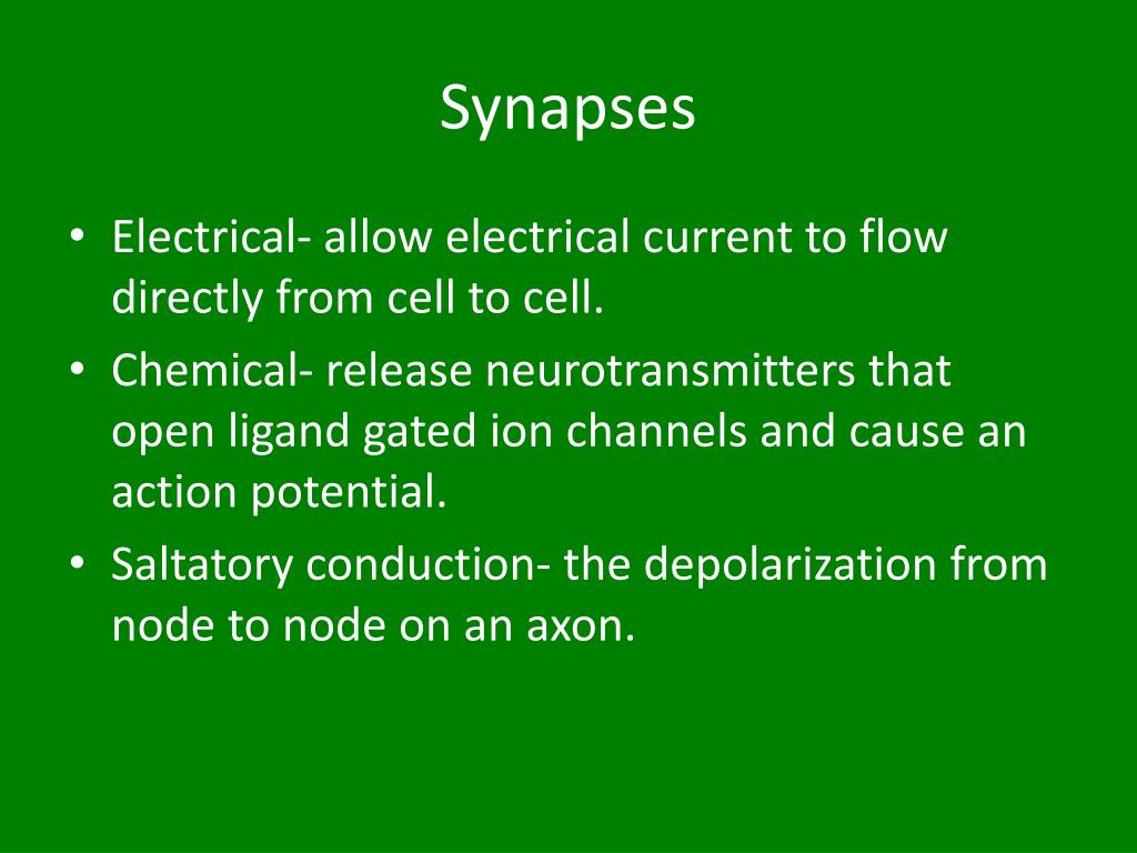 Synapses • Electrical- allow electrical current to flow directly from cell to cell. • Chemical- release neurotransmitters that open ligand gated ion channels and cause an action potential. • Saltatory conduction- the depolarization from node to node on an axon.