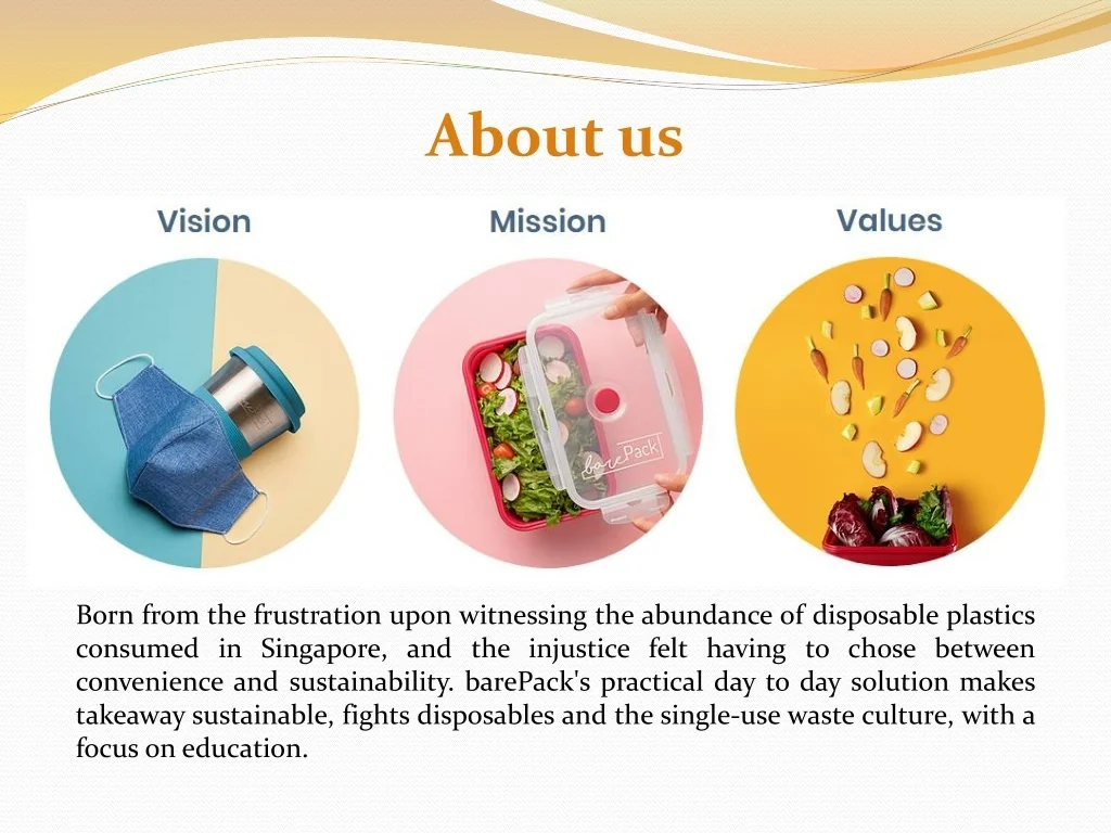 About us Born from the frustration upon witnessing the abundance of disposable plastics consumed in Singapore, and the injustice felt having to chose between convenience and sustainability. barePack's practical day to day solution makes takeaway sustainable, fights disposables and the single-use waste culture, with a focus on education.