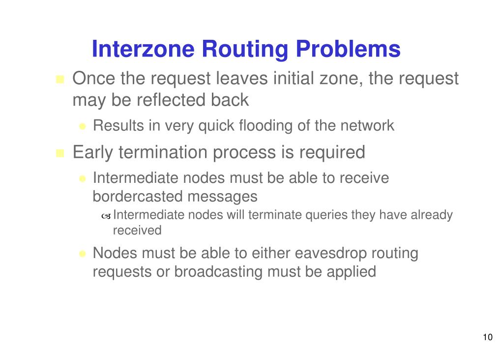 Interzone Routing Problems • Once the request leaves initial zone, the request may be reflected back • Results in very quick flooding of the network • Early termination process is required • Intermediate nodes must be able to receive bordercasted messages • Intermediate nodes will terminate queries they have already received • Nodes must be able to either eavesdrop routing requests or broadcasting must be applied