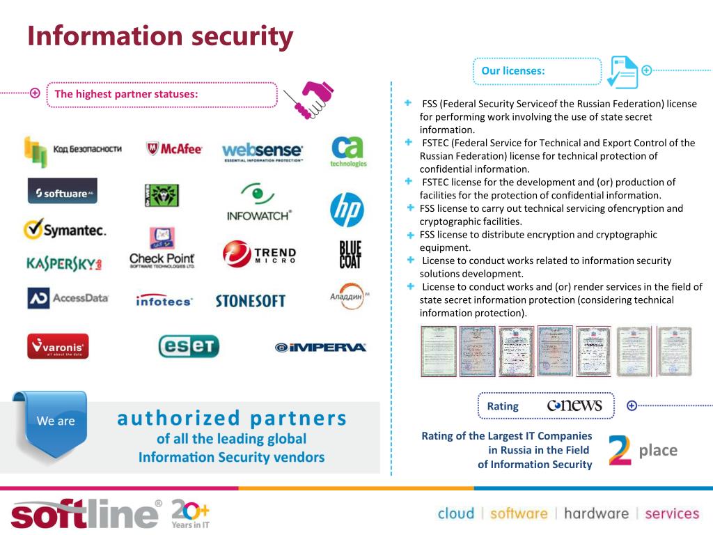 Information security Our licenses: The highest partner statuses: FSS (Federal Security Serviceof the Russian Federation) license for performing work involving the use of state secret information. FSTEC (Federal Service for Technical and Export Control of the Russian Federation) license for technical protection of confidential information. FSTEC license for the development and (or) production of facilities for the protection of confidential information. FSS license to carry out technical servicing ofencryption and cryptographic facilities. FSS license to distribute encryption and cryptographic equipment. License to conduct works related to information security solutions development. License to conduct works and (or) render services in the field of state secret information protection (considering technical information protection). Rating Rating of the Largest IT Companies in Russia in the Field of Information Security place