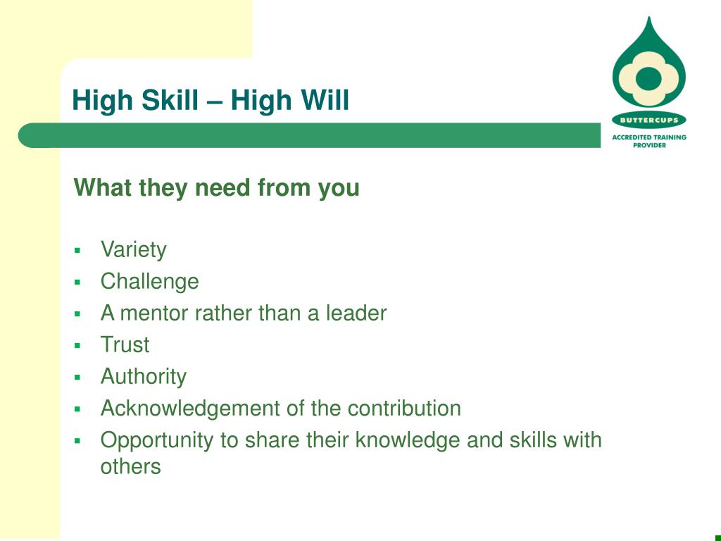 High Skill – High Will What they need from you • Variety • Challenge • A mentor rather than a leader • Trust • Authority • Acknowledgement of the contribution • Opportunity to share their knowledge and skills with others
