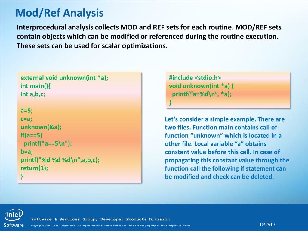 Mod/Ref Analysis Interprocedural analysis collects MOD and REF sets for each routine. MOD/REF sets contain objects which can be modified or referenced during the routine execution. These sets can be used for scalar optimizations. external void unknown(int *a); int main(){ inta,b,c; a=5; c=a; unknown(&a); if(a==5) printf("a==5\n"); b=a; printf("%d %d %d\n",a,b,c); return(1); } #include <stdio.h> void unknown(int *a) { printf(“a=%d\n”, *a); } Let’s consider a simple example. There are two files. Function main contains call of function “unknown“ which is located in a other file. Local variable “a” obtains constant value before this call. In case of propagating this constant value through the function call the following if statement can be modified and check can be deleted.