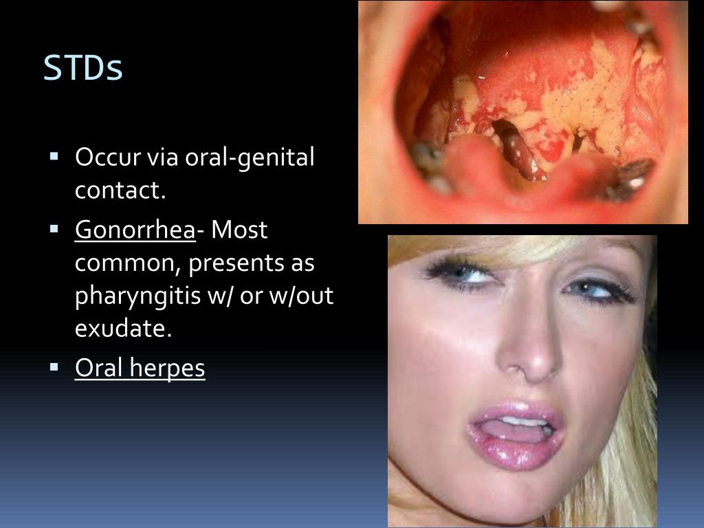 STDs • Occur via oral-genital contact. • Gonorrhea- Most common, presents as pharyngitis w/ or w/out exudate. • Oral herpes