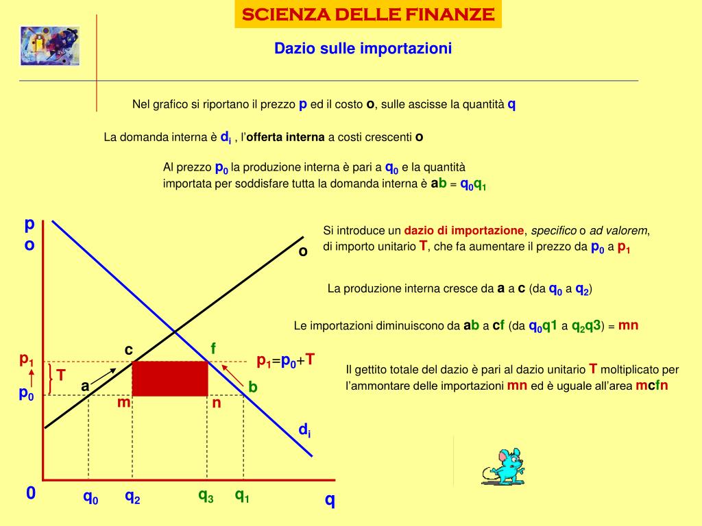 SCIENZA DELLE FINANZE. Dazio sulle importazioni. Nel grafico si riportano il prezzo p ed il costo o , sulle ascisse la quantità q. La domanda interna è d i , l’ offerta interna a costi crescenti o. Al prezzo p 0 la produzione interna è pari a q 0 e la quantità