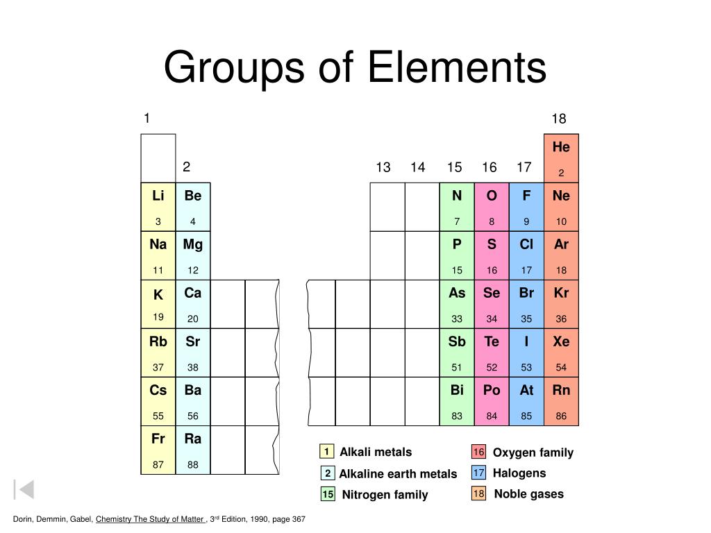 Groups of Elements He 2 Li 3 Be 4 N 7 O 8 F 9 Ne 10 Na 11 Mg 12 P 15 S 16 Cl 17 Ar 18 K 19 Ca 20 As 33 Se 34 Br 35 Kr 36 Rb 37 Sr 38 Sb 51 Te 52 I 53 Xe 54 Cs 55 Ba 56 Bi 83 Po 84 At 85 Rn 86 Fr 87 Ra 88 1 18 2 13 14 15 16 17 Alkali metals Oxygen family 1 16 Halogens Alkaline earth metals 17 2 Noble gases Nitrogen family 18 15 Dorin, Demmin, Gabel, Chemistry The Study of Matter , 3rd Edition, 1990, page 367