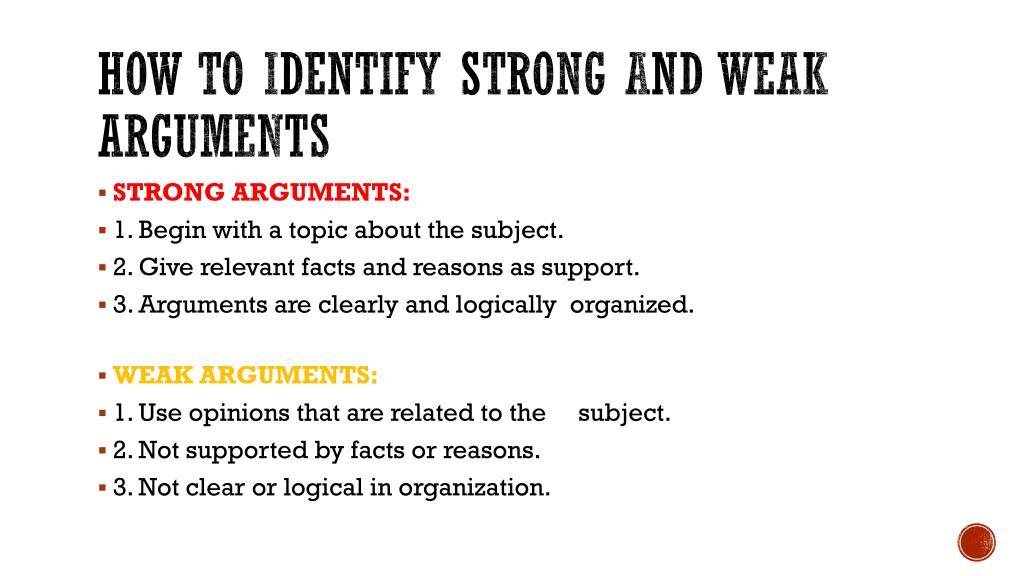 How to identify strong and weak arguments • STRONG ARGUMENTS: • 1. Begin with a topic about the subject. • 2. Give relevant facts and reasons as support. • 3. Arguments are clearly and logically organized. • WEAK ARGUMENTS: • 1. Use opinions that are related to the subject. • 2. Not supported by facts or reasons. • 3. Not clear or logical in organization.