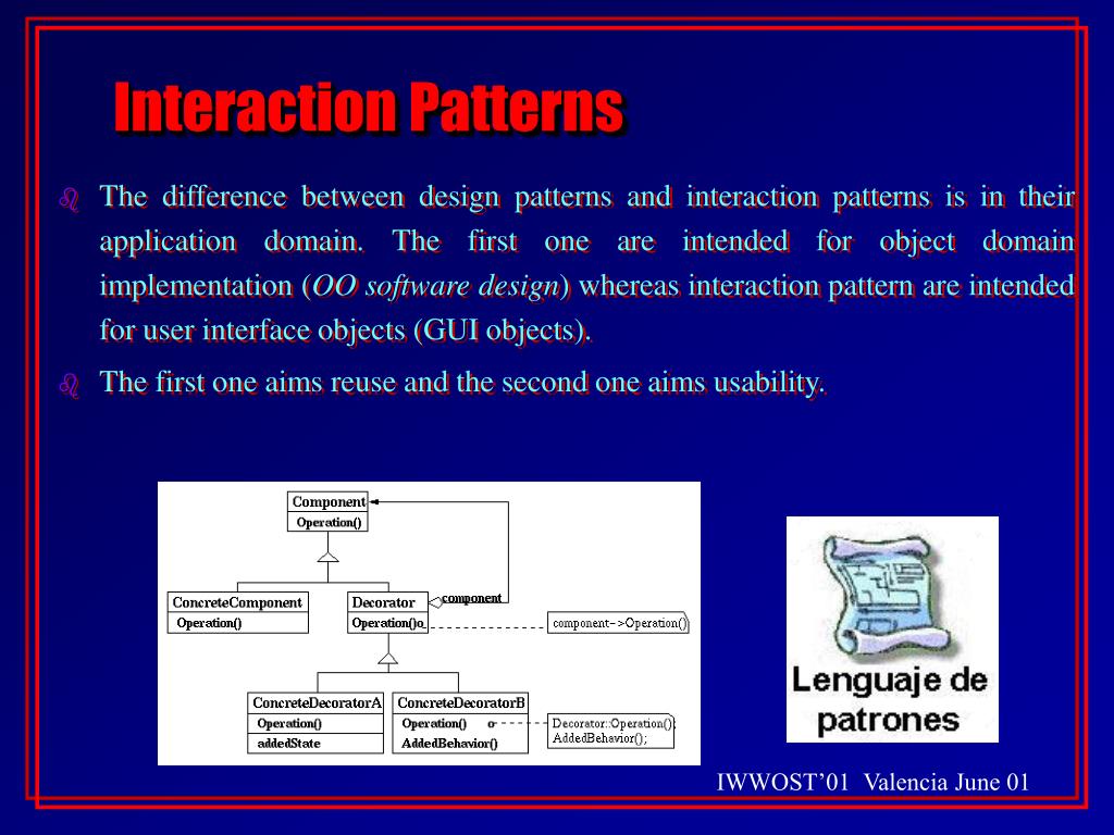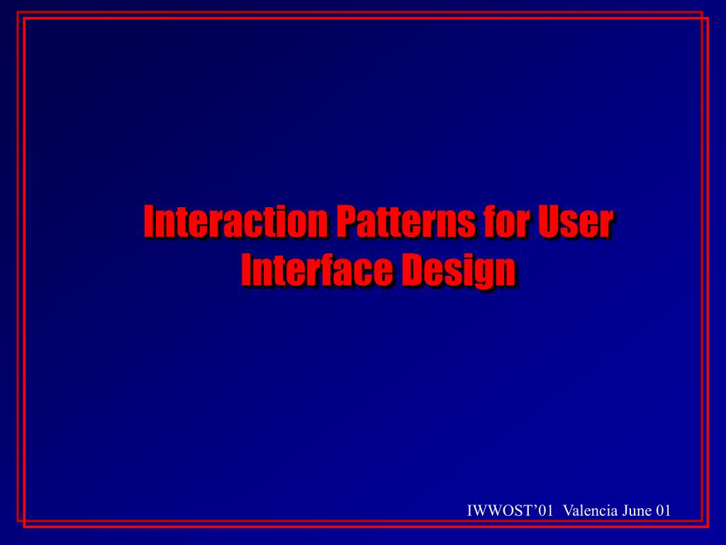 Interaction Patterns • The difference between design patterns and interaction patterns is in their application domain. The first one are intended for object domain implementation (OO software design) whereas interaction pattern are intended for user interface objects (GUI objects). • The first one aims reuse and the second one aims usability.