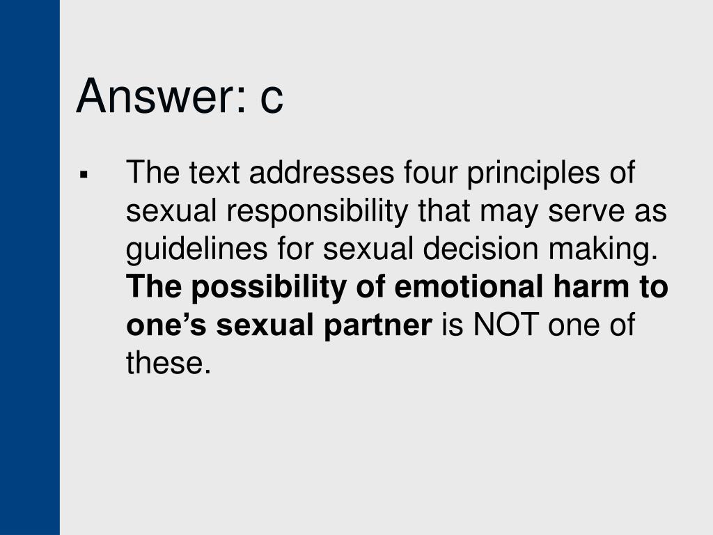 Answer: c • The text addresses four principles of sexual responsibility that may serve as guidelines for sexual decision making. The possibility of emotional harm to one’s sexual partner is NOT one of these.