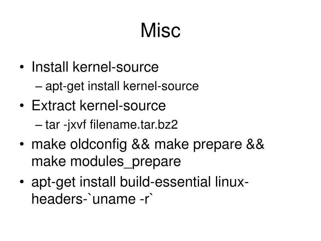 Misc • Install kernel-source • apt-get install kernel-source • Extract kernel-source • tar -jxvf filename.tar.bz2 • make oldconfig && make prepare && make modules_prepare • apt-get install build-essential linux-headers-`uname -r`