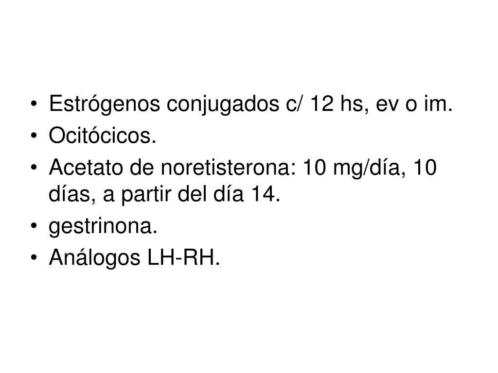 Estrógenos conjugados c/ 12 hs, ev o im. • Ocitócicos. • Acetato de noretisterona: 10 mg/día, 10 días, a partir del día 14. • gestrinona. • Análogos LH-RH.