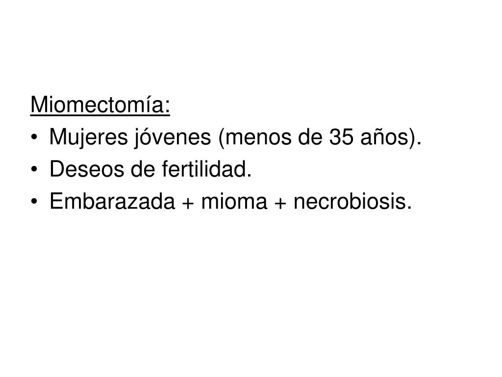 Miomectomía: Mujeres jóvenes (menos de 35 años). Deseos de fertilidad. Embarazada + mioma + necrobiosis.