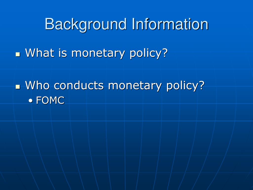 Background Information • What is monetary policy? • Who conducts monetary policy? • FOMC