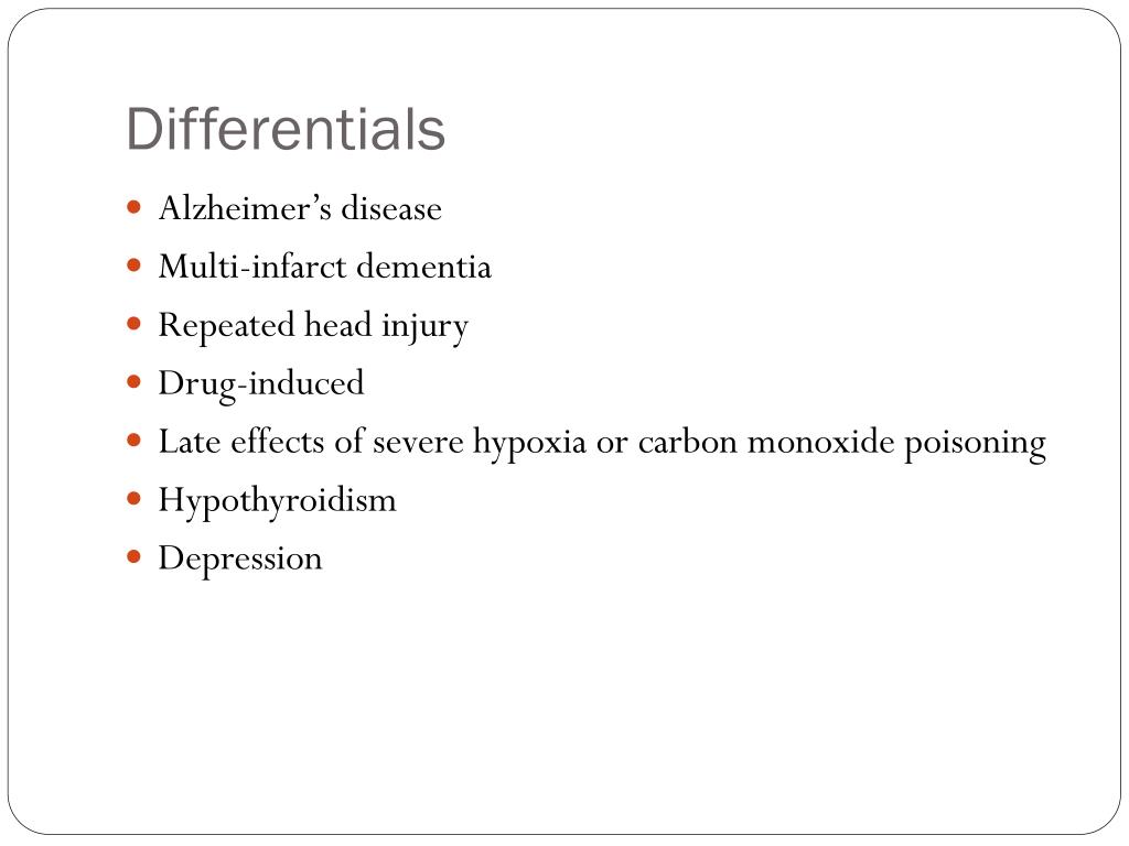Differentials • Alzheimer’s disease • Multi-infarct dementia • Repeated head injury • Drug-induced • Late effects of severe hypoxia or carbon monoxide poisoning • Hypothyroidism • Depression