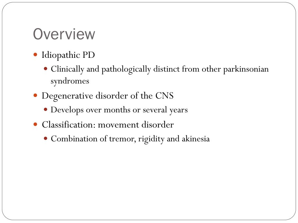 Overview • Idiopathic PD • Clinically and pathologically distinct from other parkinsonian syndromes • Degenerative disorder of the CNS • Develops over months or several years • Classification: movement disorder • Combination of tremor, rigidity and akinesia