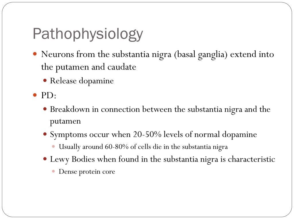 Pathophysiology • Neurons from the substantianigra (basal ganglia) extend into the putamen and caudate • Release dopamine • PD: • Breakdown in connection between the substantianigra and the putamen • Symptoms occur when 20-50% levels of normal dopamine • Usually around 60-80% of cells die in the substantianigra • Lewy Bodies when found in the substantianigra is characteristic • Dense protein core