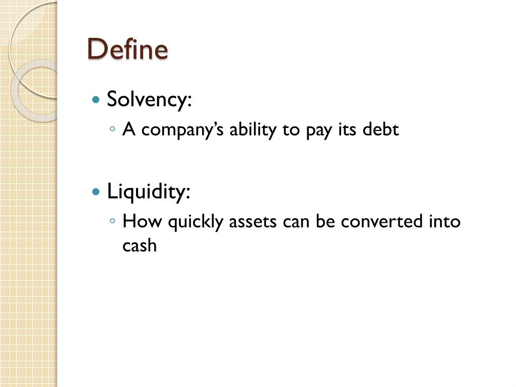 Define • Solvency: • A company’s ability to pay its debt • Liquidity: • How quickly assets can be converted into cash