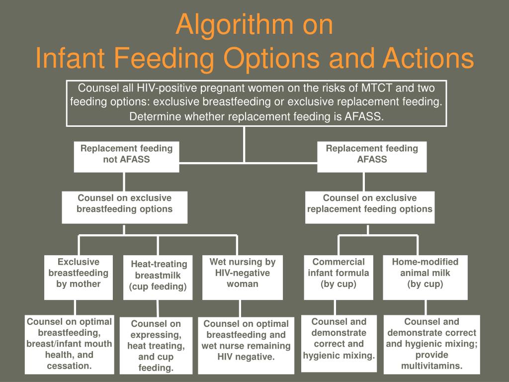 Counsel all HIV-positive pregnant women on the risks of MTCT and two feeding options: exclusive breastfeeding or exclusive replacement feeding. Determine whether replacement feeding is AFASS. Replacement feeding not AFASS Replacement feeding AFASS Counsel on exclusive breastfeeding options Counsel on exclusive replacement feeding options Exclusive breastfeeding by mother Heat-treating breastmilk (cup feeding) Wet nursing by HIV-negative woman Commercial infant formula (by cup) Home-modified animal milk (by cup) Counsel on optimal breastfeeding, breast/infant mouth health, and cessation. Counsel and demonstrate correct and hygienic mixing. Counsel and demonstrate correct and hygienic mixing; provide multivitamins. Counsel on expressing, heat treating, and cup feeding. Counsel on optimal breastfeeding and wet nurse remaining HIV negative. Algorithm on Infant Feeding Options and Actions