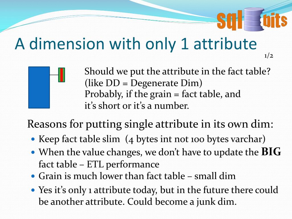 A dimension with only 1 attribute 1/2 Reasons for putting single attribute in its own dim: • Keep fact table slim (4 bytes int not 100 bytes varchar) • When the value changes, we don’t have to update the BIGfact table – ETL performance • Grain is much lower than fact table – small dim • Yes it’s only 1 attribute today, but in the future there could be another attribute. Could become a junk dim. Should we put the attribute in the fact table? (like DD = Degenerate Dim) Probably, if the grain = fact table,and it’s short or it’s a number.