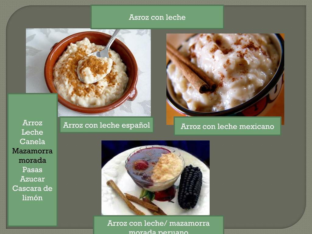 Asroz con leche Arroz Leche Canela Mazamorramorada Pasas Azucar Cascara de limón Arroz con lecheespañol Arroz con lechemexicano Arroz con leche/ mazamorramoradaperuano